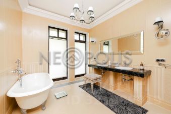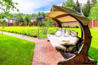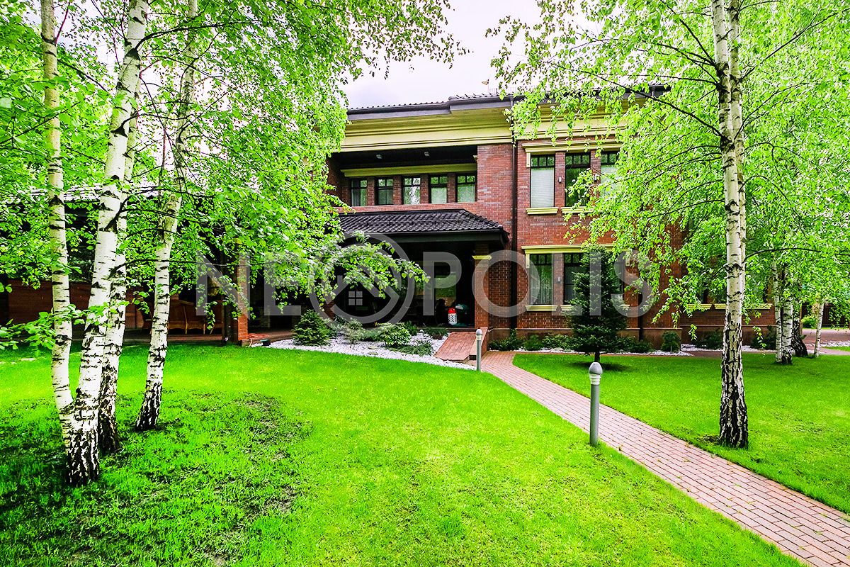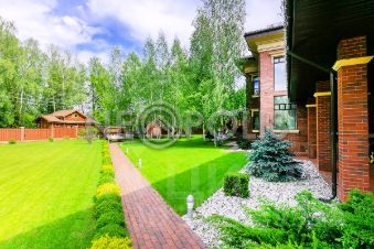 Просторный ровный участок с английским газоном, выполнен дренаж и установлена система автоматического полива, имеется декоративное уличное освещение.