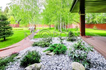 На участке растут березы, высажены декоративные кустарники, облагорожены две зоны каменного сада (из гальки и гранитной крошки), дорожки отмостки и парковки для авто выложены натуральной керамической клинкерной брусчаткой.
