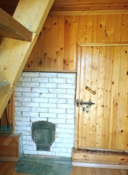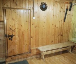 Сама баня построена из бруса, остальная пристройка из деревянных реек. На первом этаже кухня-гостевая, парилка, душевая комната (душевая кабина, умывальник), на втором этаже спальня.