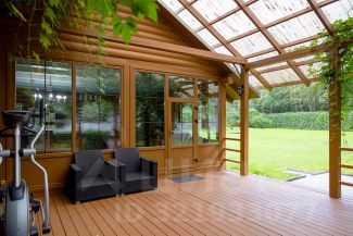 Дополнительные строения: гараж с квартирой для персонала, русская баня с зоной отдыха, беседка для барбекю с кухней и водоснабжением, летняя беседка, детская площадка.