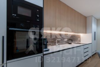 Остаётся встроенная кухня с техникой Gorenje (варочная панель, вытяжка, микроволновая печь, духовой шкаф, новая посудомоечная машина), большой диван и зона TV.