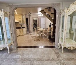 Дом двухэтажный, с качественным современным ремонтом и бережной эксплуатацией. На первом этаже расположена просторная гостиная, столовая зона и кухня с итальянской мебелью и гарнитуром из массива дерева.