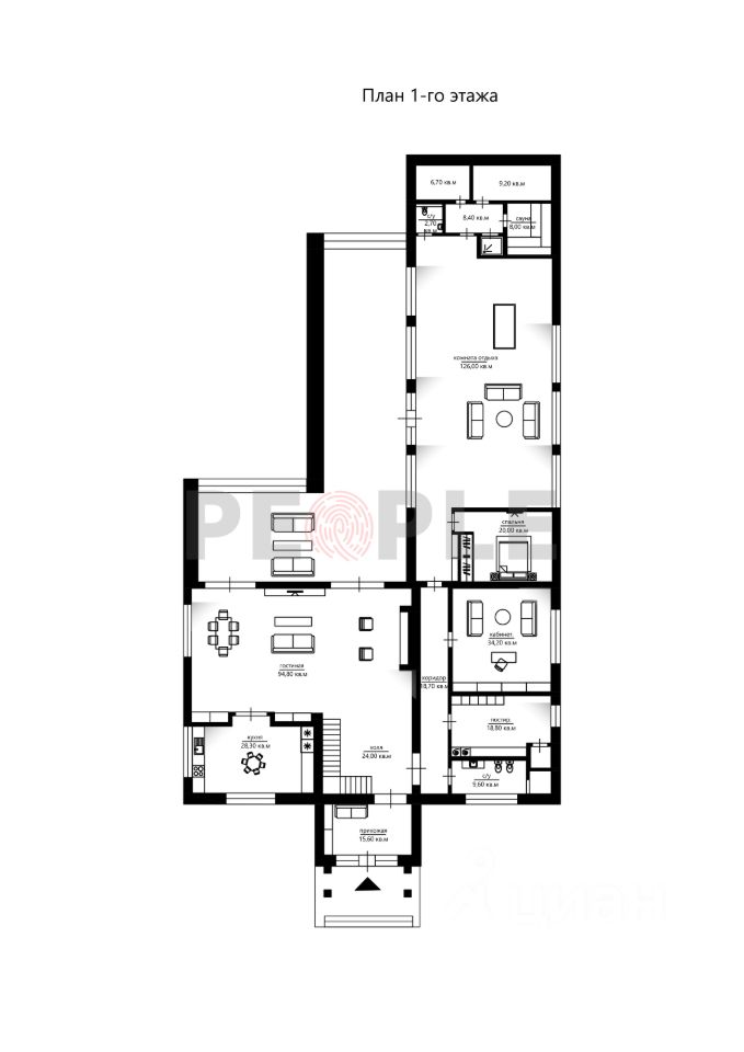 1-й этаж: гостиная-столовая-кухня , кабинет, постирочная-бойлерная, санузел, спа-зона, выход на террасу.