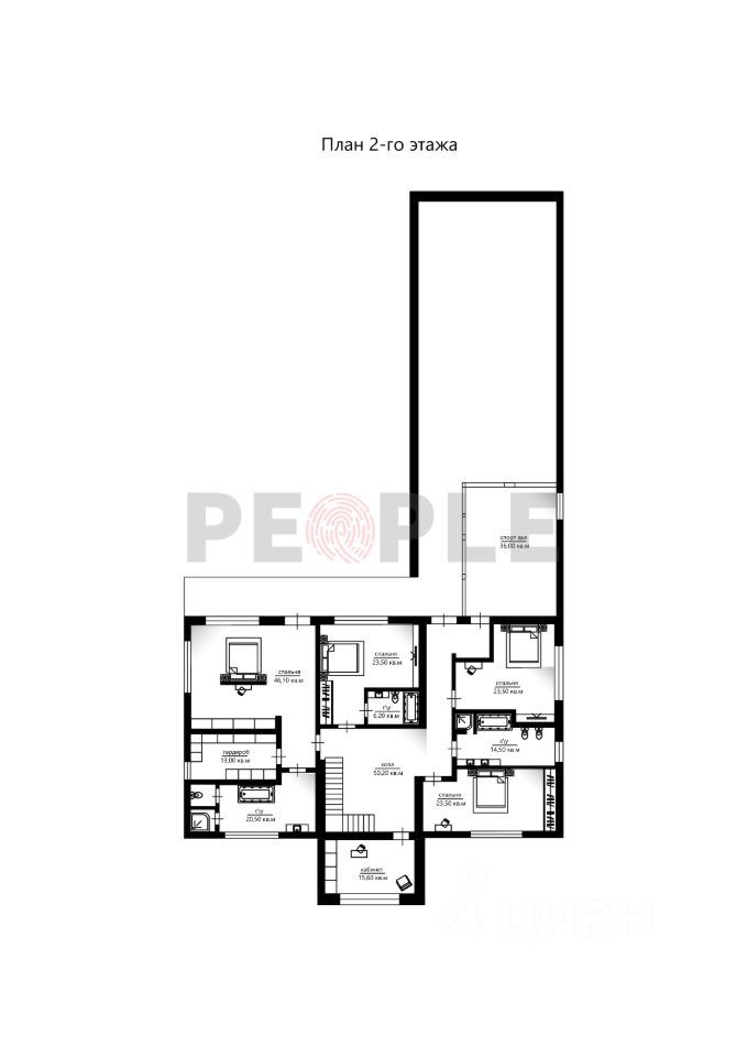 2-й этаж: 5 спален, включая мастер-спальню с ванной и гардеробной, 3 ванные комнаты, панорамный тренажерный зал с выходом на эксплуатируемую кровлю.