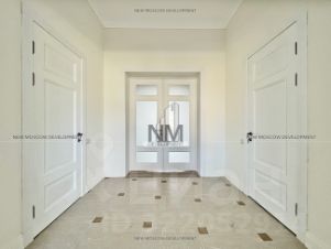 На первом этаже - 2 спальни с гардеробными и собственными санузлами, просторный холл, кухня/столовая, гостиная с каминным залом, гостевой санузел, выход на просторную террасу, котельная, проход в дом для персонала, гардеробные решения.