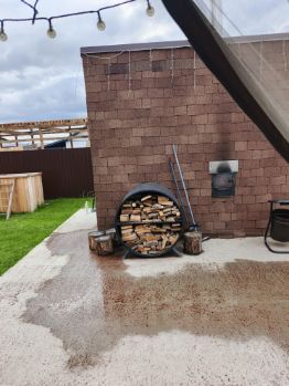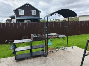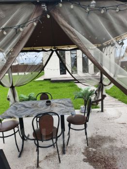 Всё для отдыха на воздухе: просторная зона под шатром, мангальная площадка с раковиной и дровником. Вся зона барбекю стоит на монолитной плите — чистота и порядок в любую погоду.