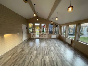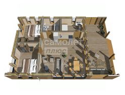 Внутреннее пространство отделано имитацией бруса, создавая атмосферу тепла и уюта