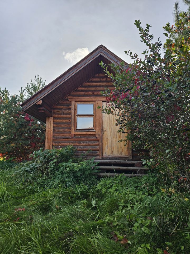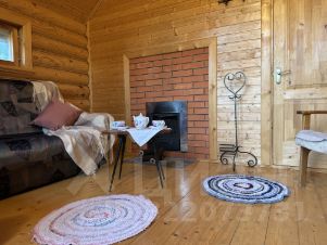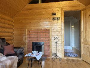 Отдельностоящая зимняя баня из оцилиндрованного бревна с дровяной печью и просторной комнатой отдыха.