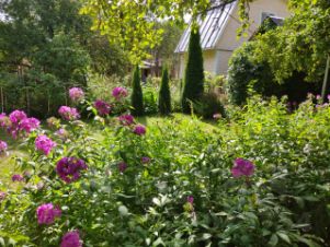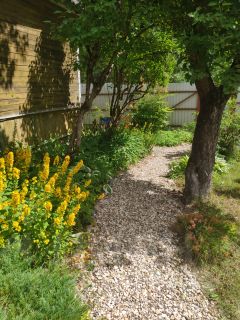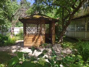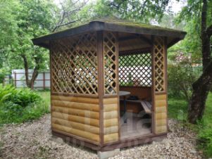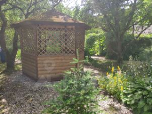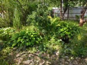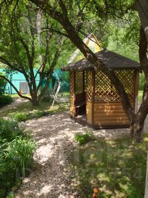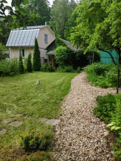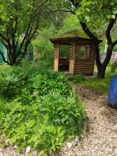 На участке есть хозпостройки: сарай, летняя кухня с баней, навес со скамейками и столом и отдельно стоящий туалет. Участок полностью обихожен, дорожки, декоративный прудик, растения, разные кусты, деревья, оборудованы компостные кучи. Имеется уютная беседка с освещением.