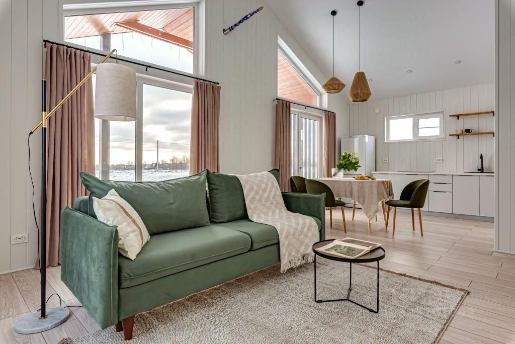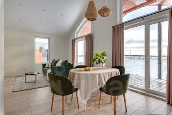 Планировка включает пять комнат: две спальни, просторную кухню, гостиную и санузел. Все помещения обставлены мебелью и оснащены необходимой бытовой техникой. Высокие потолки и панорамные окна создают ощущение простора и наполняют дом естественным светом.