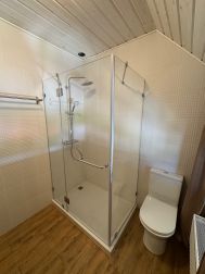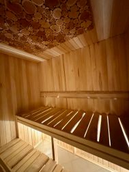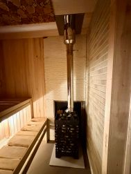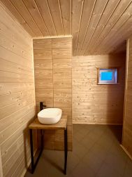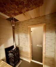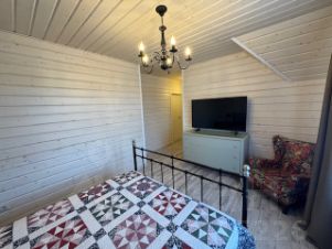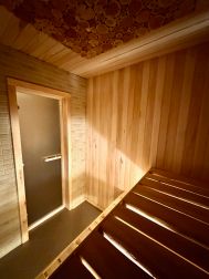 На участке есть крытая парковка с бетонной плитой, хоз. блок и баня, полностью готовая к использованию ( установлена печь, обустроен с/у, душевая, комната отдыха с мебелью). Все постройки на участке выполнены в едином стиле.