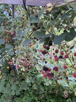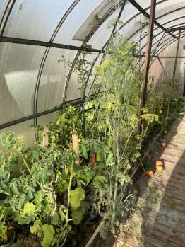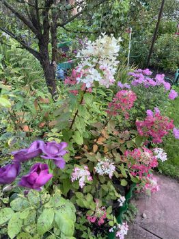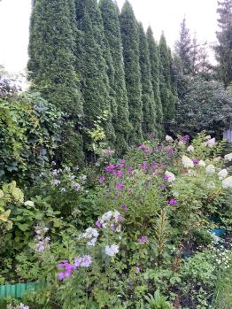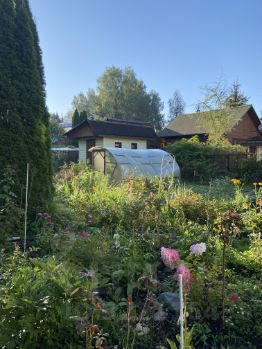 На ухоженном участке настоящий сад: плодоносящие деревья и кустарники, многочисленные цветы, декоративные туи. Всё создано с любовью и заботой.