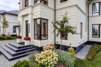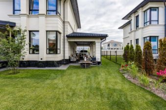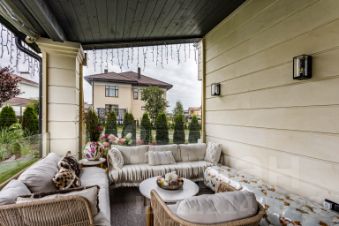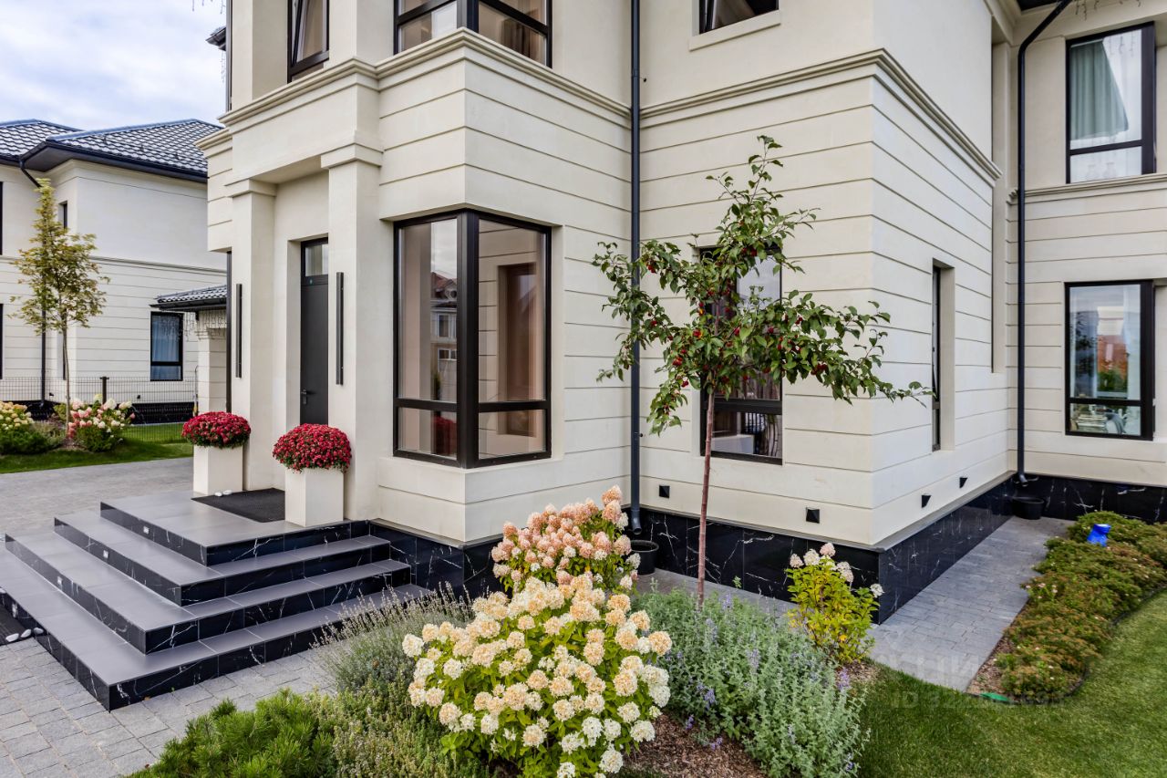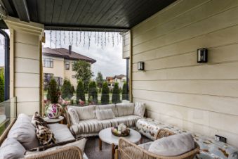 На участке выполнен профессиональный ландшафтный дизайн в современном стиле. Для отдых на свежем опытом в доме оборудована уютная меблированная терраса.