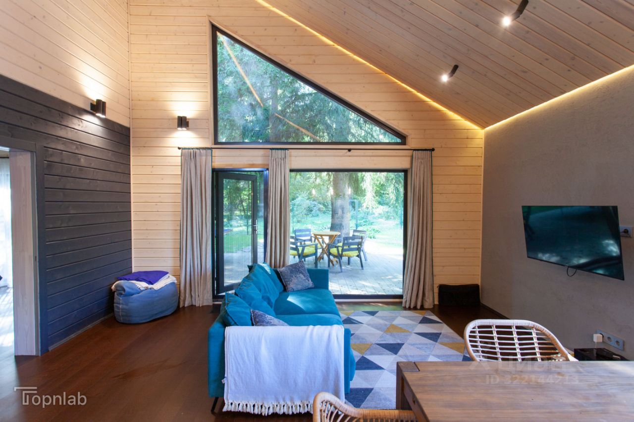 Основной одноэтажный дом площадью 120 кв.м. и высокими потолками (до 6 метров), состоит из 3х спален, 2х санузлов (один из них в мастер-спальне), кухни, совмещенной с гостиной, котельной, мансардным этажом (под кабинет), панорамными окнами. В 2х детских есть небольшой антресольный этаж для уединения с книжкой на мягком пуфе или игр.