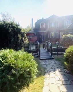 Участок правильной формы, ухоженный и оформленный в современном ландшафтном стиле, с зелёным газоном, декоративными плодовыми деревьями и соснами. На территории расположен пруд с системой очистки воды, который можно использовать как бассейн. Здесь также есть мангальная зона с каменной печкой под навесом и уютная зона отдыха с резными качелями — идеальное место для семейных посиделок и встреч с друзьями!