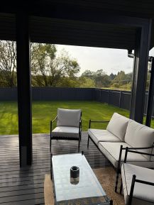 Площадь террасы - 50 квадратных метров, часть террасы с садовой мебелью под крышей, можно спокойно проводить время даже в сильный дождь