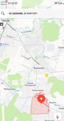 Координаты участка — 55.20056496, 37.41911371 — позволяют легко найти участок через навигатор или смартфон, что значительно упрощает осмотр и планирование строительства. Доступ на участок не ограничен.