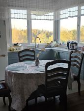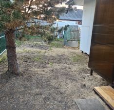 Выхода два, две веранды, в сторону дома и большая на обратную, где растут три большие сосны и две берёзы