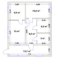 В доме большая терасса-прихожая 14 кв. м., бойлерная 5 кв. м., смежный санузел 6,3 кв. м., две комнаты 12,5 и 9,5 кв. м., кухня 13 кв. м.