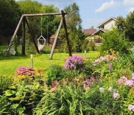 На участке естественный пруд. Кустарники и плодовые деревья.