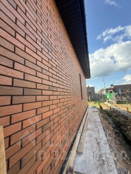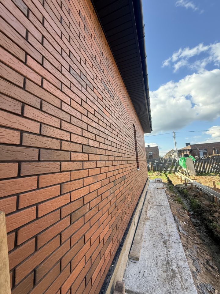 * Фасад отделан облицовочным кирпичом, придающим дому стильный и солидный вид.