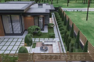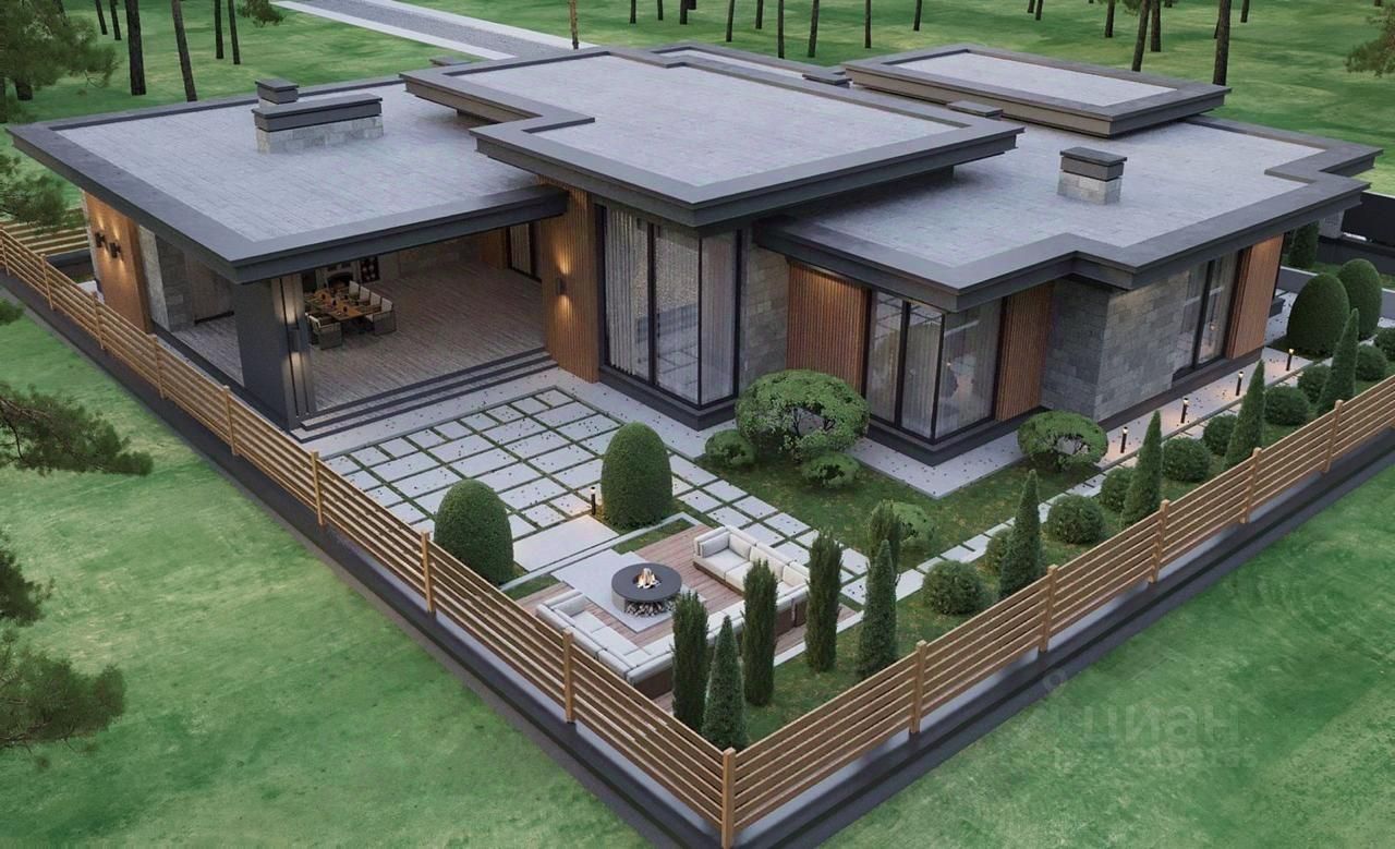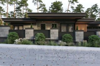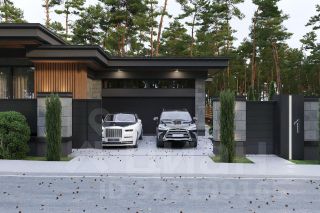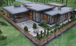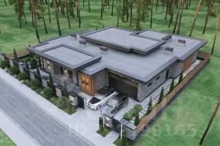 Индивидуальный проект одноэтажного дома с разноуровневой плоской крышей и нестандартной формой, общей площадью 436 кв м, включает просторную прихожую, 2 гардеробных, 2 хозяйственных комнаты, большую светлую гостинную-столовую с увеличенными потолками за счет разноуровневой крыши, кухню, 4 спальни, 3 ванных комнаты, котельную, гараж на 2 машины, а так же спа-зону с отдельной ванной и душевой, сауной и хаммам. Открытое патио 80 кв м.