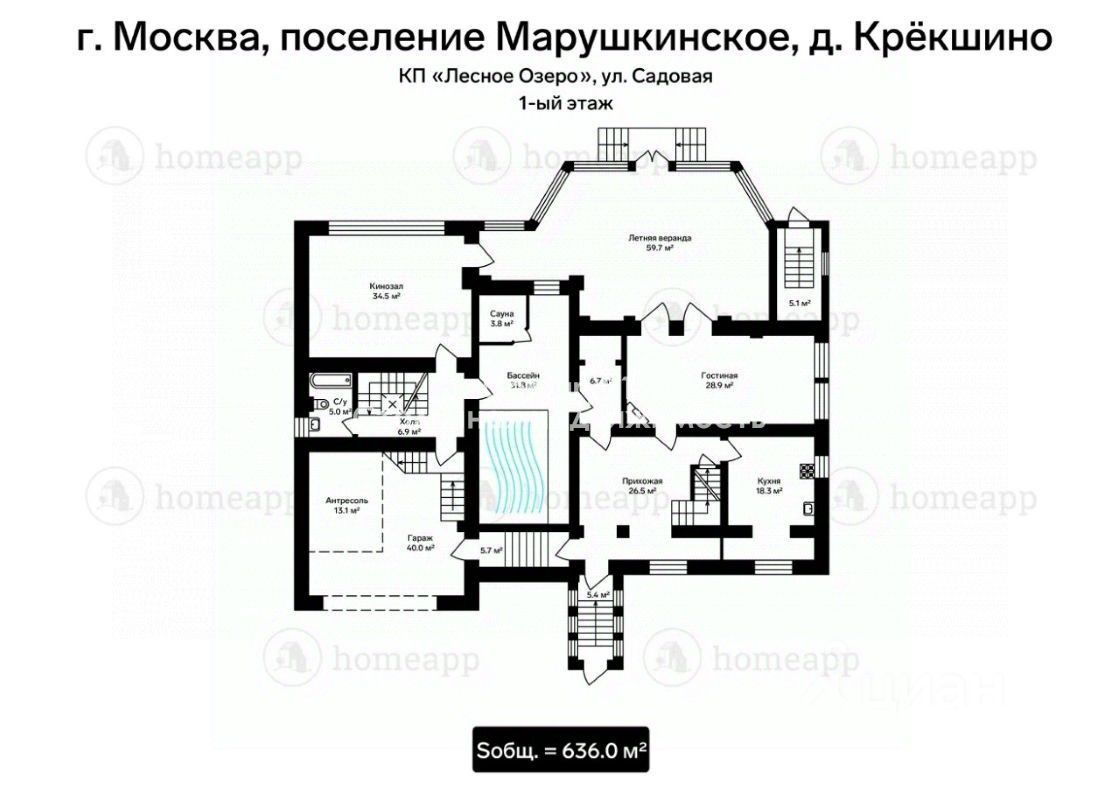 -1 этаж: прихожая, санузел, гостиная с камином, просторный зимний сад с выходом на участок, кухня, кинозал, санузел и СПА-зона: сауна, бассейн, душевая, купель.