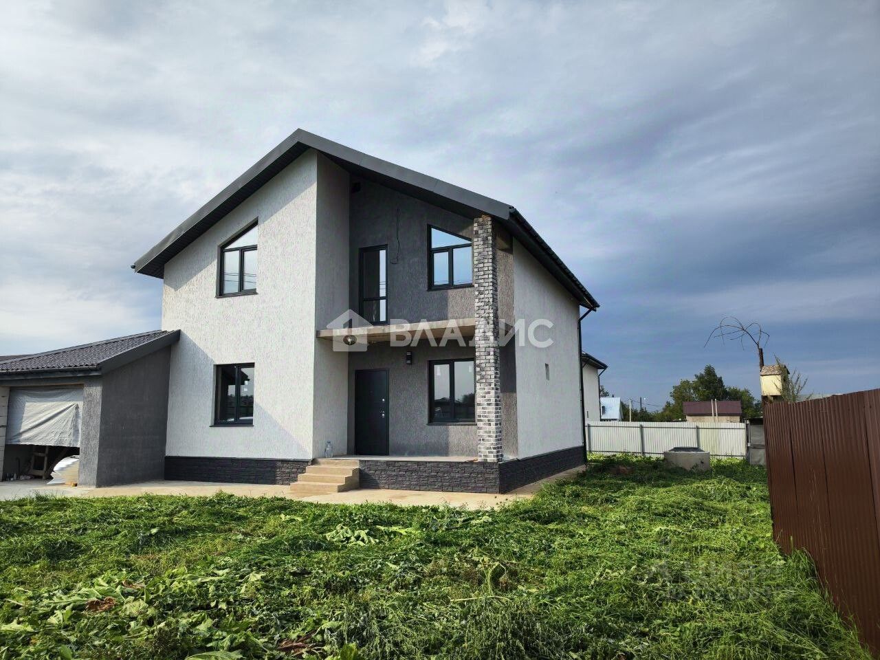 Дом находится на участке площадью 7,5 соток. На участке так же расположен гараж, проведены электричество, водоснабжение и канализация. Участок огорожен забором из профлиста с откатными воротами. Заезд на участок от ворот до гаража залит бетоном. Подъезд к участку круглогодичный.