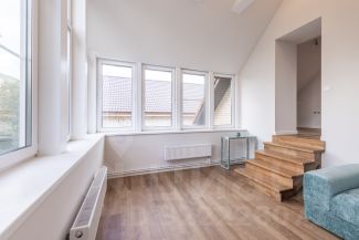 1 этаж - гостиная-столовая с выходом на огромную открытую лоджию, 2 спальни, коридор с лестницей на 2 этаж, санузел с ванной.