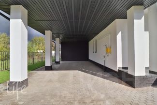 1 этаж: прихожая, гостиная-кухня-столовая с вторым светом с выходом на летнюю веранду, с/у, спальня, бойлерная/постирочная, кладовая с входом с улицы, навес для автомобиля, интегрированный с домом.
