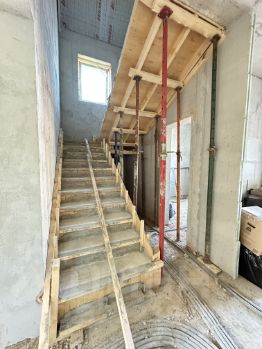 Выстроены все внутренние перегородки, оштукатурены все стены, сделана лестница.