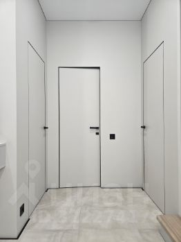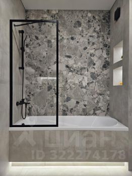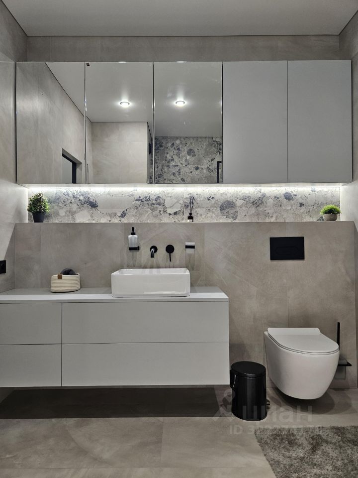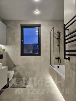Сантехника: душевой уголок встроенный, раковина, водяной полотенцесушитель, безободковый унитаз, заказная мебель.