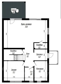 Первый этаж: кухня-гостиная 37 кв.м, кладовая у кухни, гостевая спальня, кладовая под лестницей, с/у, бойлерная, терраса.
