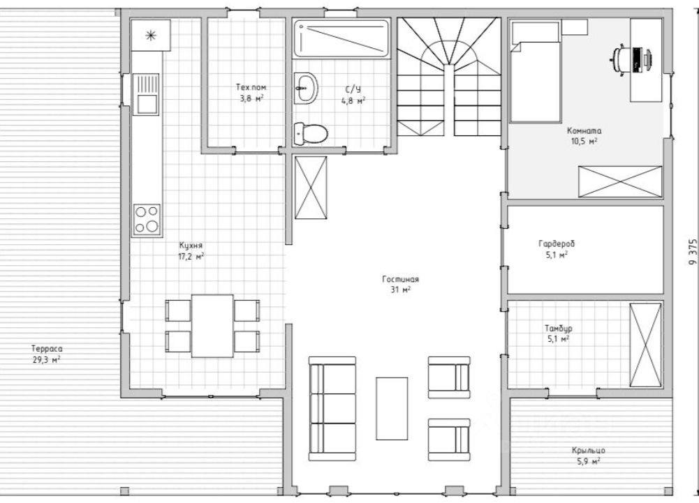 Внутренняя площадь дома - 155 кв. метров. Планировкой предусмотрено 4 жилых комнаты, 2 санузла и просторная кухня-гостиная. Также имеется терраса площадью 29,3 кв. метра. В доме установлены окна ПВХ и металлическая входная дверь с терморазрывом. Дом сдается без отделки, высота потолков 2,5 метра с возможностью увеличения.