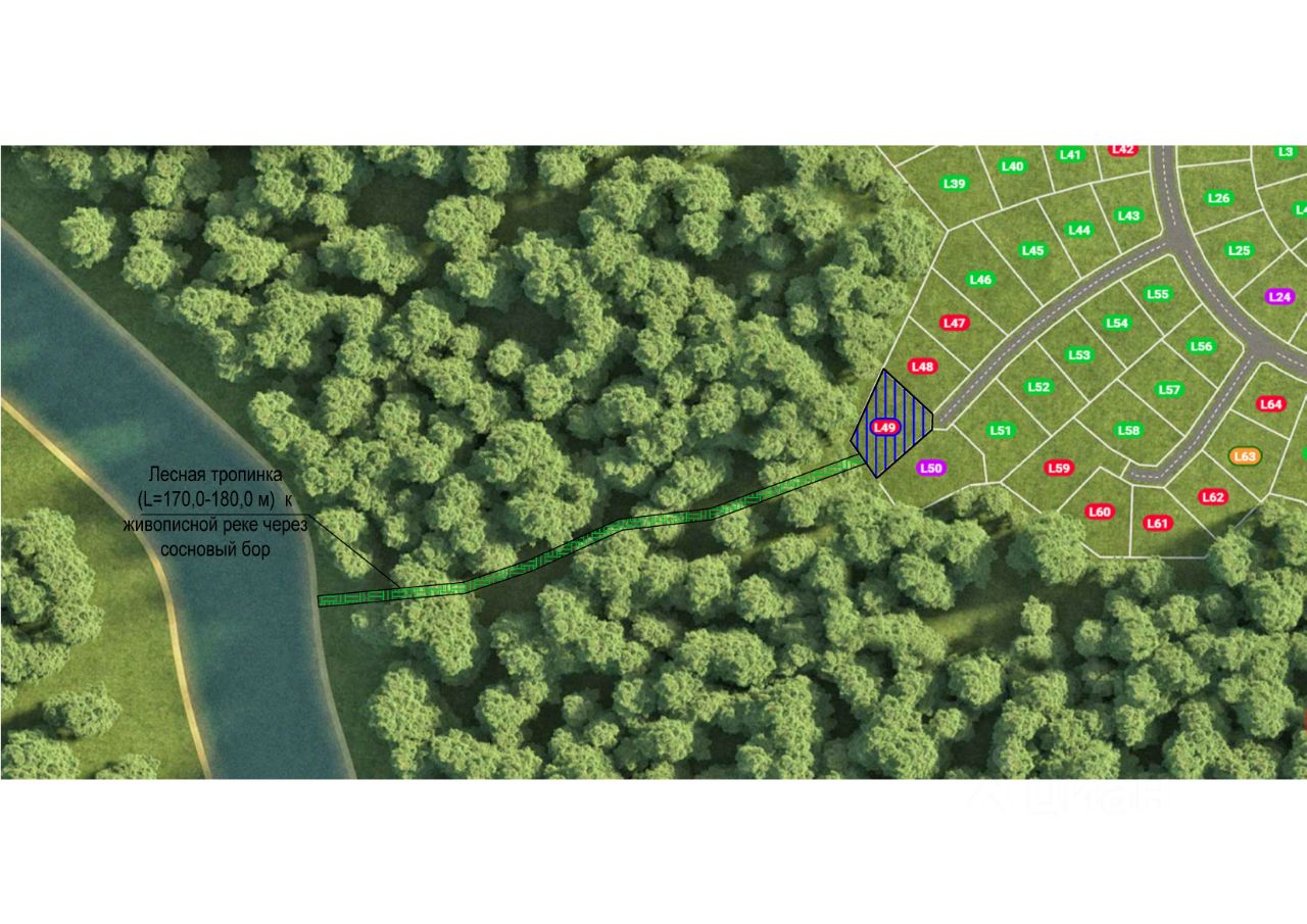 Участок тупиковый, что обеспечивает максимальную приватность и тишину. Его границы частично примыкают к живописному сосновому бору, а собственные деревья создают неповторимую атмосферу лесной сказки. От участка проложена удобная лесная тропа, ведущая к живописной реке, всего в 200 метрах от вашего будущего дома.