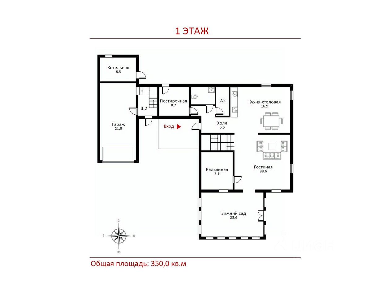 1 этаж: холл, кухня, столовая, гостиная, зимний сад.