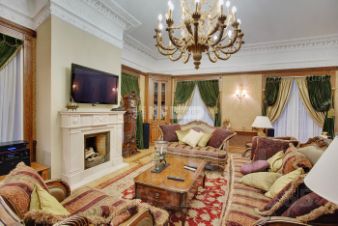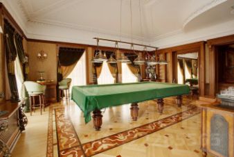 1 этаж: прихожая, 2 раздевалки, гостевой туалет, холл, гостиная с камином и плазменной панелью, кухня, столовая, кабинет, библиотека, бильярдная (русский бильярд), бар и кинозал со столом для снукера, аэрохокеем и камином, гараж на 4 м/м.