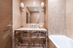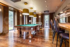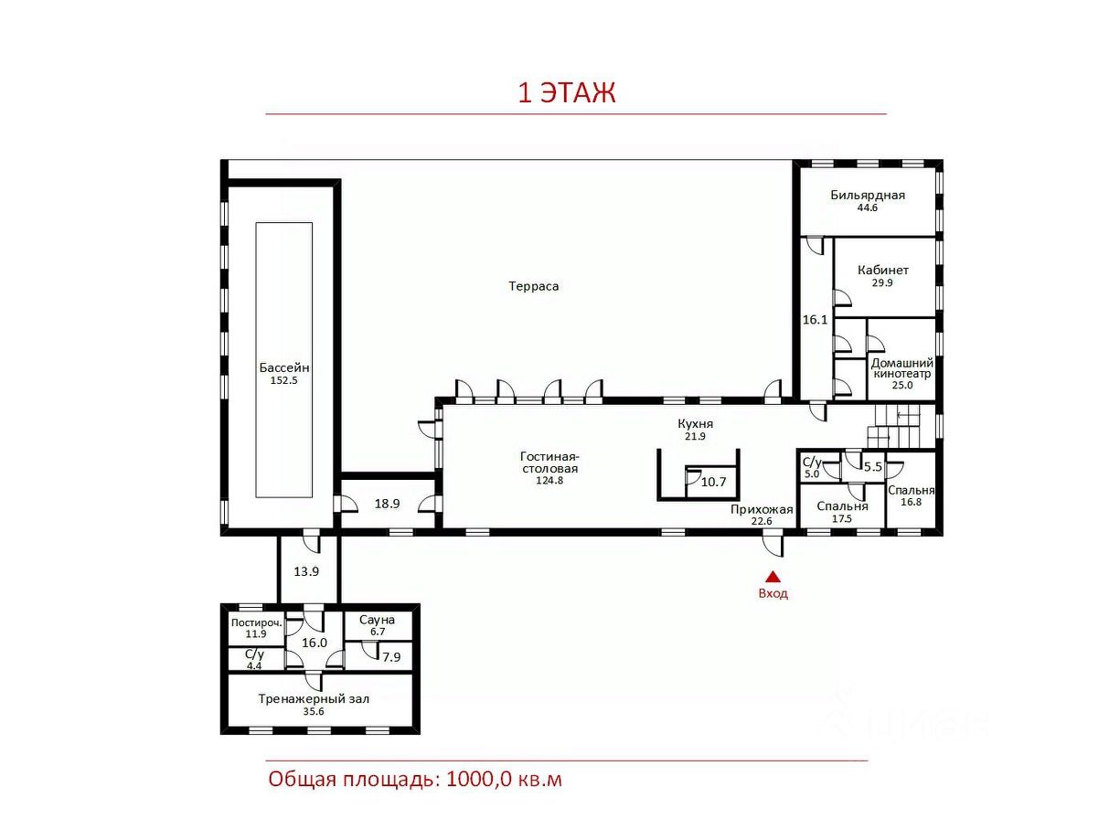 1 этаж: холл, гардеробная, гостиная с камином и выходом на террасу; зона столовой, кухня, с/у гостевой, домашний кинотеатр, кабинет, бильярдная с баром; блок: 2 спальни с с/у; зона СПА: бассейн 18м, парная, с/у, спортзал; полностью оборудованная прачечная, терраса с зоной барбекю.