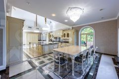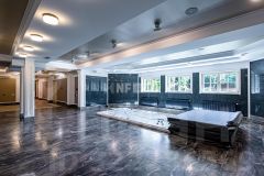 Цоколь 454 м2: зона отдыха со СПА-бассейном "Momentum Swim Spa", под чашей СПА расположен технический коридор для обслуживания чаши СПА. В зоне отдыха располагается пространство для размещения тренажеров, шезлонгов и мини кухни. Баня на дровах с выходом в зону уличного бассейна с фонтаном, комната отдыха, оборудованная душем, хаммам. Технические помещения, вент. камера, тепловые пункты, электрощитовая, прачечная, гладильная, гардеробные комнаты, оружейная, с/у, техническое помещение с оборудованием для звуковой трансляции, рабочая кухня с профессиональным оборудованием (конвектомат, гриль, холодильники, вакуумная установка, шоковая заморозка). Подземный переход связывающий основной дом с домом персонала;