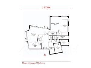 1 этаж: холл, гардеробная, кухня, столовая, гостиная с камином, 3 гостевые спальни с с/у и ванной, бассейн с комнатой отдыха с с/у и сауной.