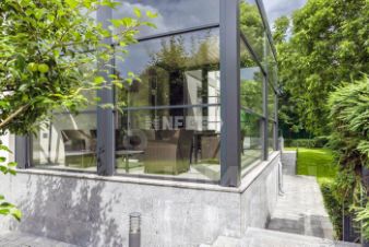 На участке с ландшафтным дизайном, площадью 30 соток, постелили газон, посадили декоративную изгородь и проложили дорожки.
