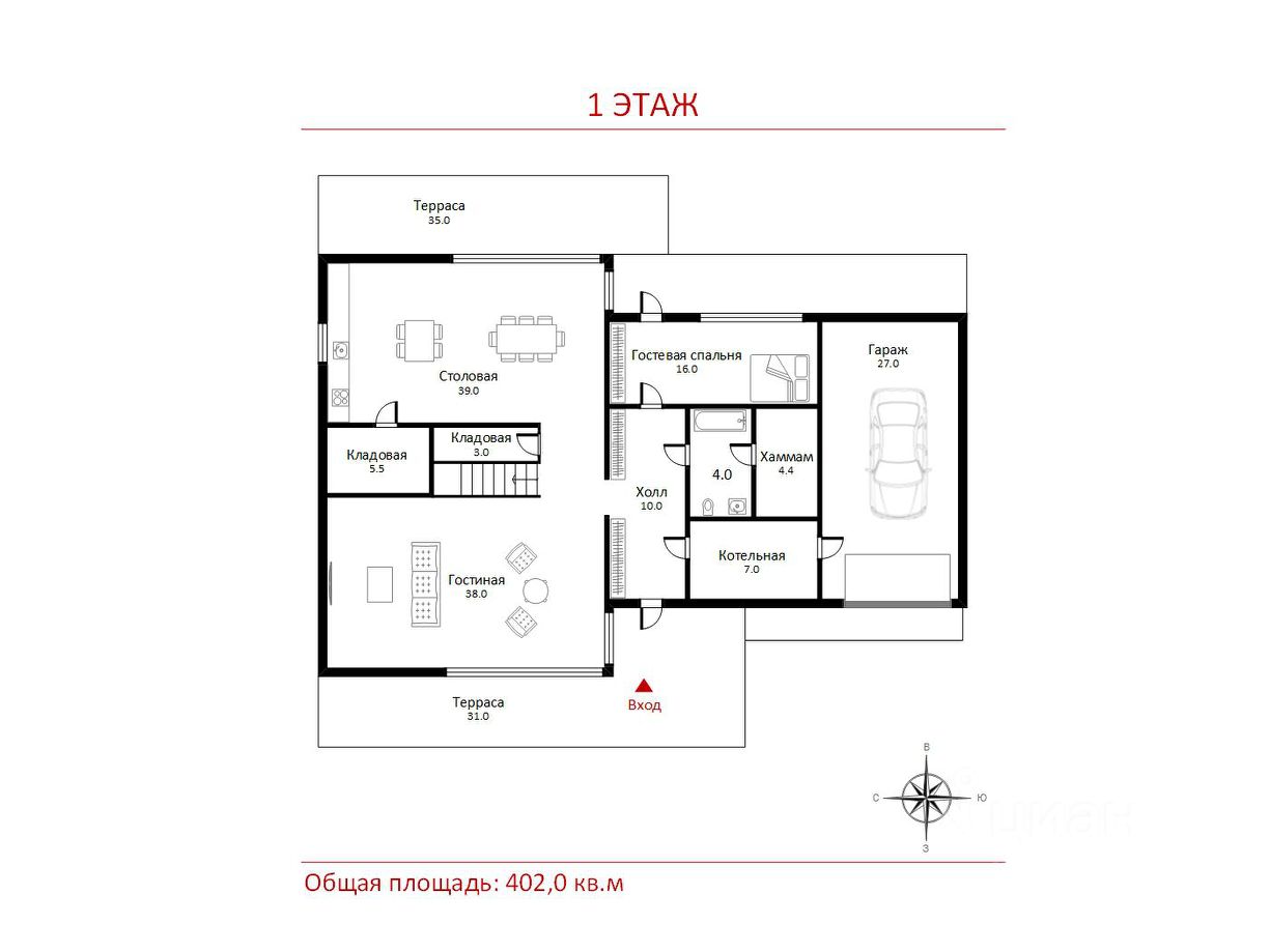 1 этаж: Холл, с/у, хаммам, котельная, гостевая спальня с выходом во двор, гостиная с выходом на террасу, кладовая, кухня-столовая с выходом на террасу, гараж на 1 м/м;