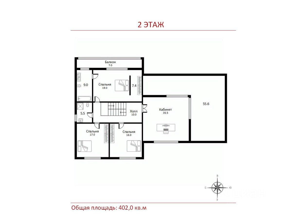 2 этаж: Холл, 2 спальни, с/у, спальня с с/у и балконом, кабинет с выходом на просторную террасу.