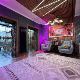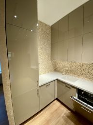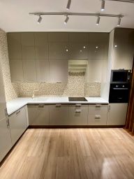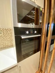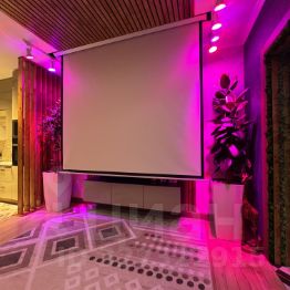 Просторная кухня и гостиная (42,6 м²) с встроенной бытовой техникой Bosch, Ariston, индукционной плитой Gorenje, литой столешницей LG с бесшовной раковиной, проектором, большим экраном и встроенной аудио-системой для уютных вечеров.
