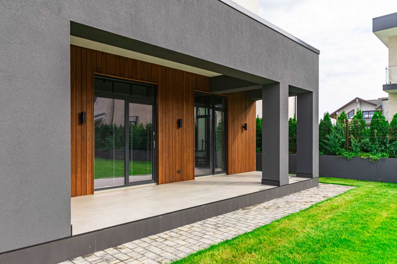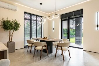 Стиль дома - современная классика с использованием натуральных материалов. Дерево, матовый камень, теплые оттенки - здесь всё настраивает на спокойный лад и дышит уютом. Панорамные окна и высокие потолки наполняют дом светом и воздухом.