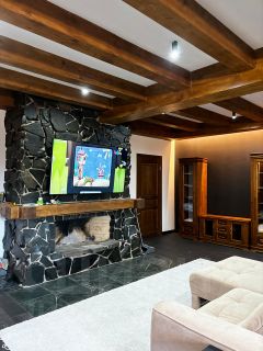 На первом этаже Большая, современная кухня (тёплый пол) и просторная Гостинная с камином, сауна с просторным залом(тёплый пол) и двумя душевыми кабинами, санузел и джакузи(тёплый пол).