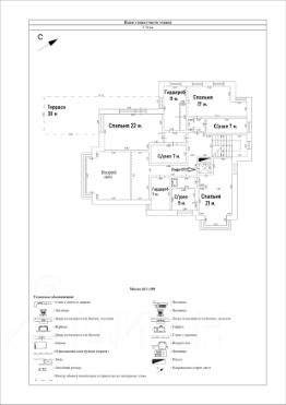1 этаж: кухня - 29 кв.м., гостиная с панорамным видом - 55 кв. м с выходом на широкую террасу (35 кв.м.) с оборудованной мокрой точкой, спальня 19 кв.м. с выходом на балкон, просторный холл, кладовые.