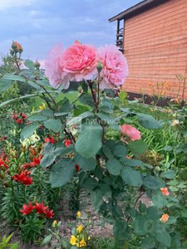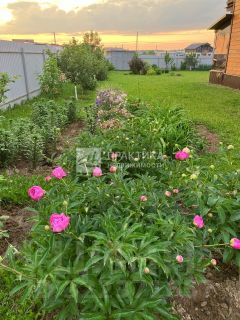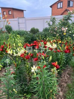 На участке много плодоносящих деревьев и кустарников, клумбы с многолетними цветами и хвойными растениями, теплица и две высокие грядки.