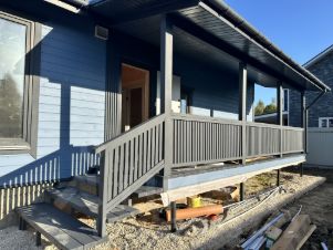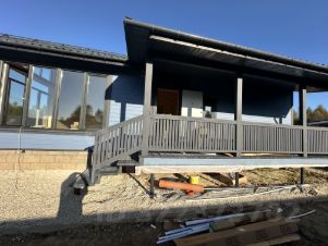 Дом обшит имитацией бруса и выкрашен, внутри вагонка. Ванная комната в плитке, установлена мебель и сантехника.