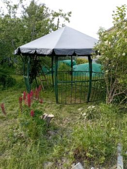 Соседи живут круглый год,есть охрана. Деревья,кусты,цветы,грядки,батут,большой крытый коварный мангал, качели, беседка и все остальные дачные аксессуары. Участок с одной стороны с небольшим уклоном,по этому проблем со стоячей водой нет,даже после продолжительных сильных дождей через час всё сухо. Потопы не страшны. Газовая труба идёт вдоль моего забора,соседи подключены к ней,мне не нужно,на лето хватает балона,подключить газпром не проблема.
